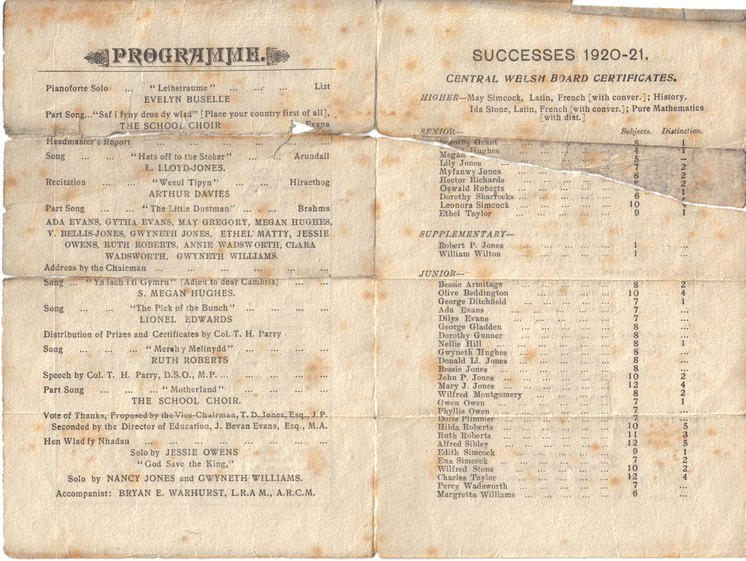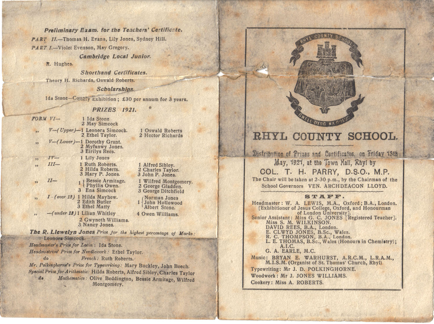 I attach a scan of the programme of this event [Rhyl County School Prizes & Certificates 1921] held at the Rhyl Town Hall for the RGS archives. I hope it transmits satisfactorily. The original I have is quite fragile and somewhat damaged due to being folded. I recognise the names of some of those mentioned, perhaps you and others will also.